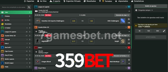 O 359Bet oferece uma grande seleção de opções de apostas em e-sports com probabilidades competitivas